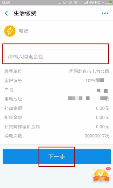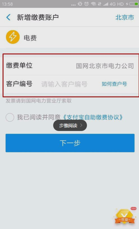 3、选择电费后,绑定水表后填写缴费单位,客户编号,然后点击下一步。