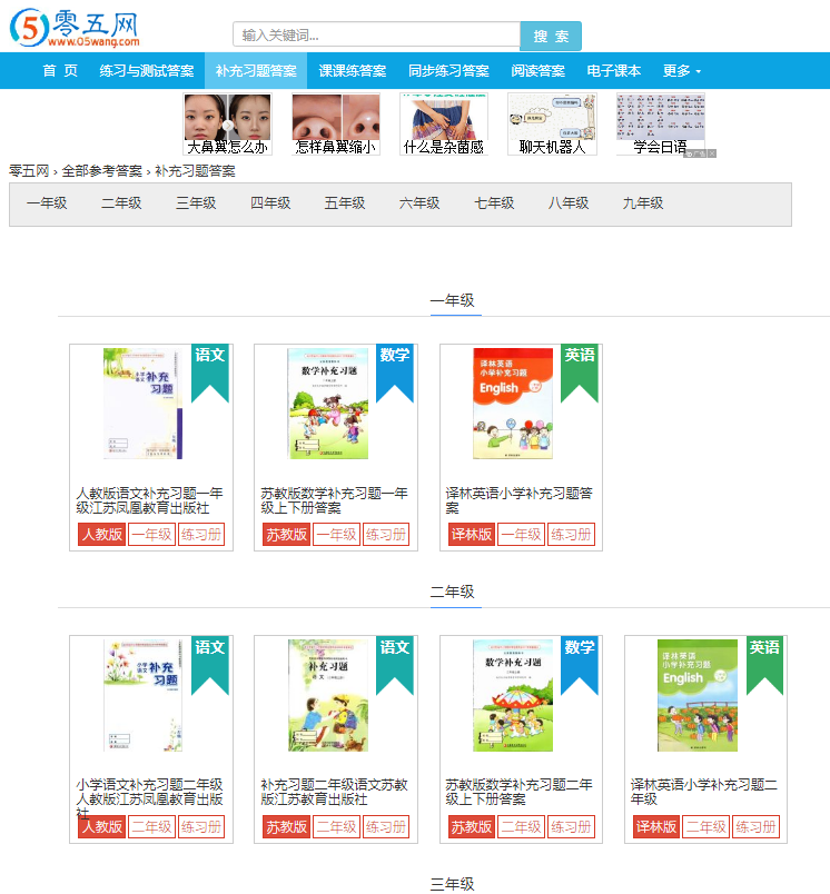 3、然后在补充习题答案页面上找到我们需要的年纪以及我们需要的课程,点击进入相关的补充习题。