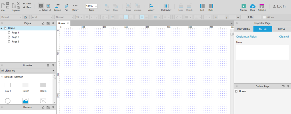 先点击开始按钮,找到“Axure RP 8.0”应用打开,默认显示四个页面,如图: