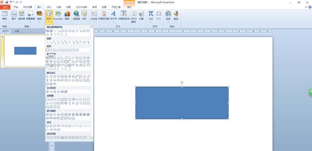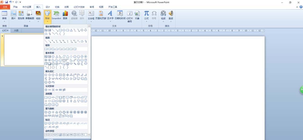 打开ppt2010,单击“插入”选项卡,在“插图”组里单击“形状”按钮。