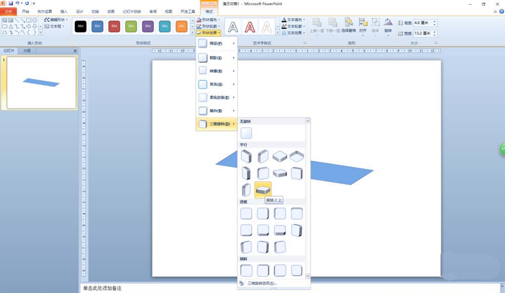在下拉菜单里选择“三维旋转”,在“三维旋转”下一级菜单中选择“平行—离轴2上”样式。