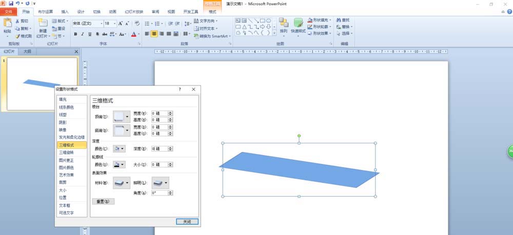 右击矩形形状,在弹出的快捷菜单中选择“设置形状格式”,在打开的“设置形状格式”对话框中选择“三维格式”。