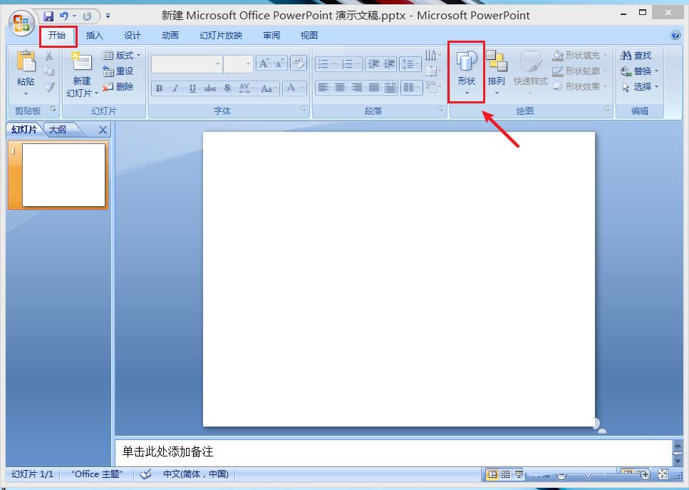 首先打开ppt,在开始工具栏下方,点击绘图的“形状”。