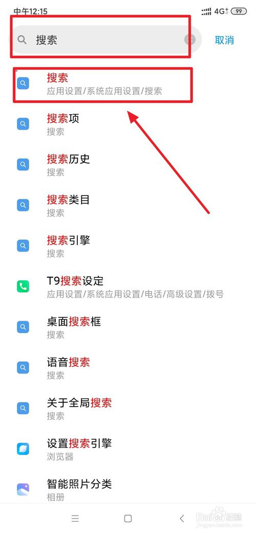 3、输入框中输入【搜索】。并点击结果中的【第一项】。