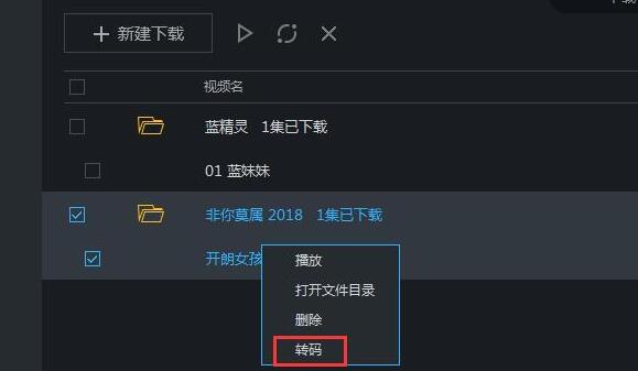 选择视频文件,右键点击视频,然后选择选择「转码」功能,如图。