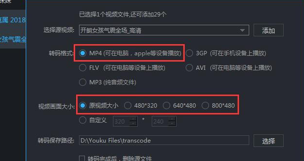 在转码窗口中,可以设置转码格式、视频画面大小。视频画面大小我们既可以直接选择软件提供的比例,也可以自己设置。