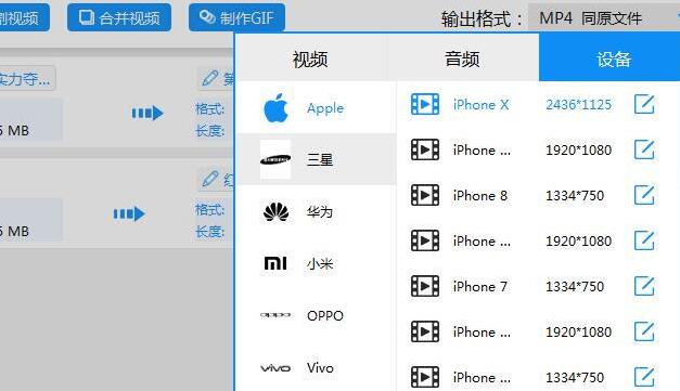 也可以在「输出格式」-「设备」那里选择对应的手机品牌型号尺寸。