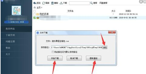 勾选文件点击下载弹出文件下载窗口,可点击浏览更改保存文件路径,点击开始下载进行下载,或者点击提取直链,提取直链就是获取下载链接网址。