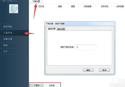 下载管理:我们下载的文件都会在该页面显示,下载中的文件能直接看到下载进度,已完成下载点击已完成就可以看到下载过的文件,点击下载设置弹出窗口设置同时下载任务数,同时任务数有最大值和最小值哦。