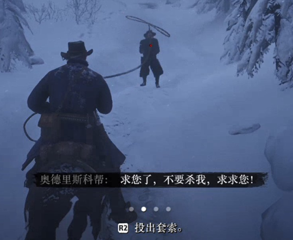 返回营地途中,会出现一个奥德里斯科尔的人,依据提示装备套索,按×键加速追过去,靠近到一定距离后投掷套索将他打下马,之后下马按○键将他五花大绑搬到马上带回去。注意五花大绑要长按○键,○键按得过快会变成殴打,殴打几下后这个奥德里斯科尔的人会被打死,任务也会失败。