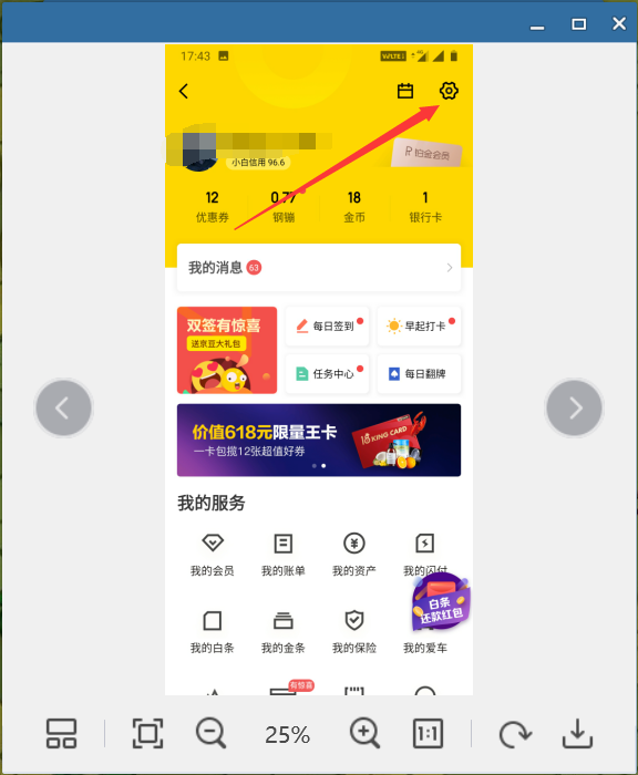1、点击打开手机上的京东金融app,然后点击进入个人页面,在个人页面上点击右上角的设置图标,进入设置页面。