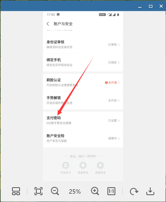 3、然后在账户与安全页面上点击打开“支付密码”选项。