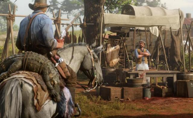 在一次成功的狩猎之后,你可以选择原地剥皮宰杀动物,或者完整地带走。不要把猎物留在地上太久,否则会有食腐动物慢慢接近。皮毛、动物材料、肉或者完整的动物尸体可以通过马匹运输卖给城镇里的肉铺,或者带回营地为炖锅加料,还可以做成服饰或者其它物品。大自然的馈赠如此丰富,完全没有让人饥饿受冻的理由。