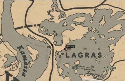 本作中的鱼饵可以从莱莫恩(Lemoyne)地区拉格拉斯湖(Lagras)的鱼饵商店购买,具体位置如下图所示: