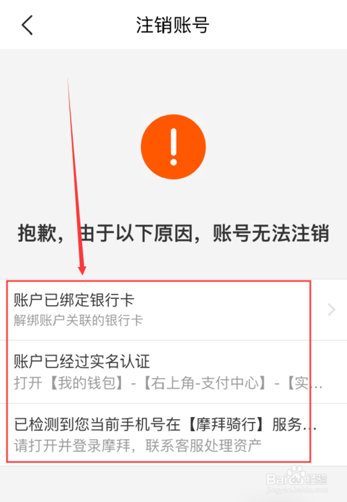 6、如果当前账号无法注销,会提示无法注销的原因,如未解绑银行卡、没有解除实名认证等,根据提示操作再次发起注销请求即可。
