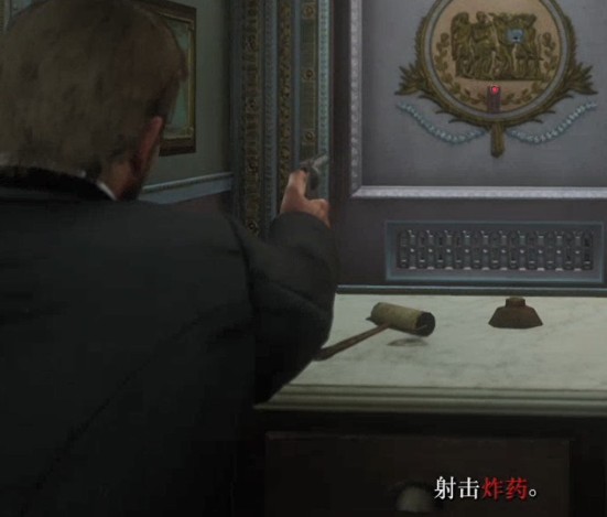 在窗口防守一会儿,达奇会叫亚瑟过去。拿起炸药,放到在墙上,然后躲到柜台后面射击炸药。