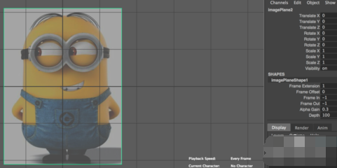 在右侧的通道盒里调整图片透明度【Alpha Gain】、大小【Width、Height】等属性。