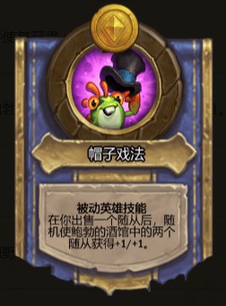 【技能描述】:在你出售一个随从后,随机使鲍勃的酒馆中的两个随从获得+1/+1。