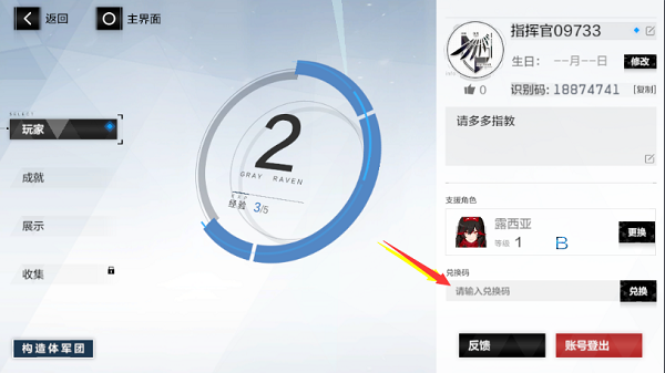 2、点击之后进入个人信息界面,在个人信息界面可以看到许多的功能,找到界面右下角的兑换选项,在兑换前面输入获得的兑换码,点击后面的兑换即可获得礼包奖励,领取之后可以直接获得奖励。