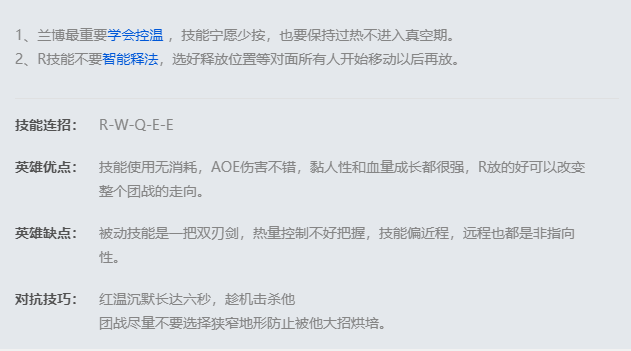 兰博的技能都能使其获得热量。当兰博的热量达到50%时,他会处于危险温度状态,所有基础技能都会获得额外效果。当热量达到100%时,他会进入过热状态,让他的普通攻击造成额外伤害,但也会让他在数秒内无法施放技能。
