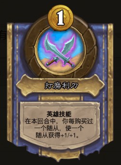 【技能描述】:在本回合中,你每购买一个过随从,使一个随从获得+1/+1.