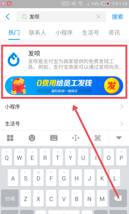 2、然后搜索“发呗”,点击进入发呗的入口。
