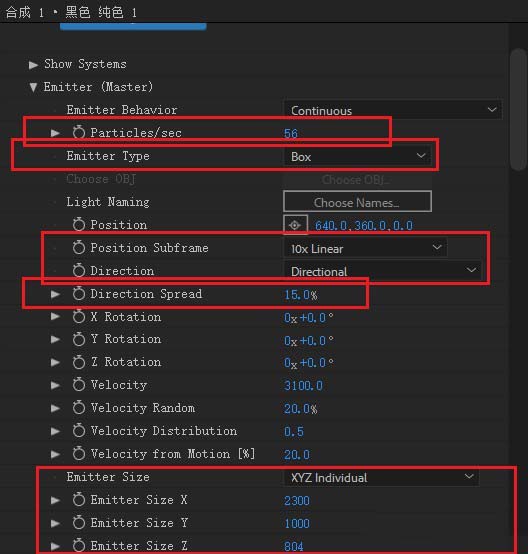 在发射器位置上,更改下列参数粒子每秒56个,发射类型是盒子,方向就是方向,方向扩展是15,速度3100,发射器xyz分别为,2300,1000,804。