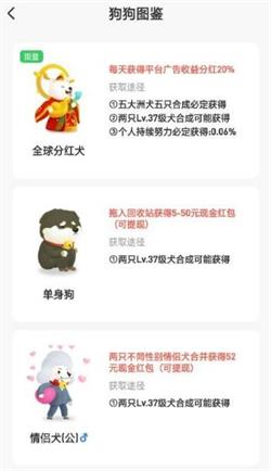 4、通过狗狗合成,获得全球分红犬、单身狗和情侣犬等等都能获得不同的现金红包奖励。如图下。