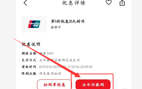 6、点开【出示付款码】,在指定门店消费即可以享受五折优惠。