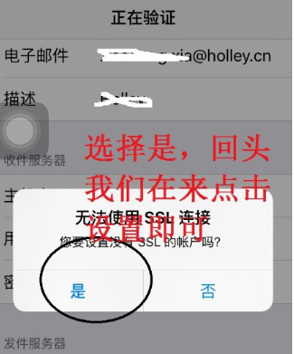 4、要是出现【无法使用SSL连接】弹窗,用户可以选择存储账户,这样你的邮箱基本已经绑定到你的手机上了;