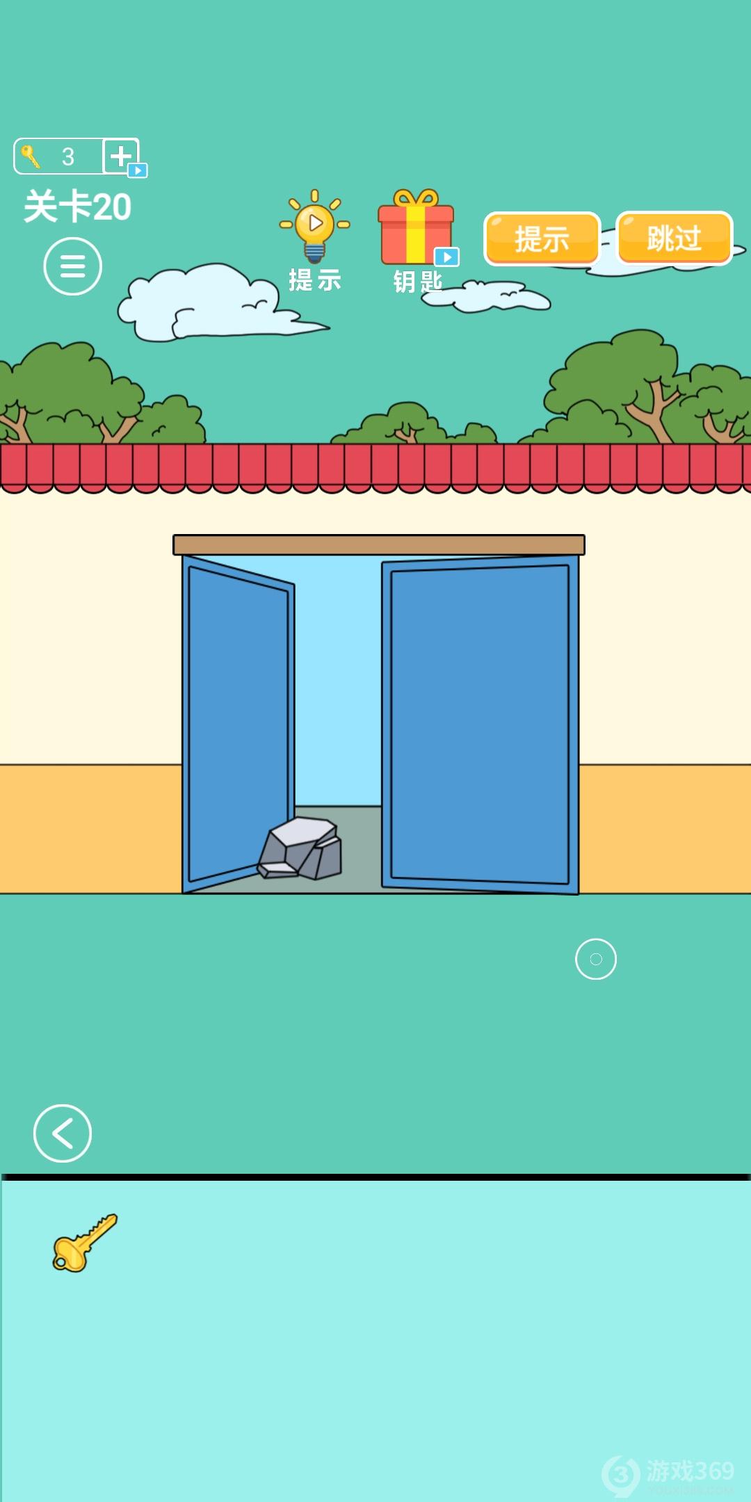 打开墙壁上的柜子获得钥匙,进入右侧场景,用钥匙打开门,再用地上的石头卡主门角,再用钥匙开大门,再从小门进去即可