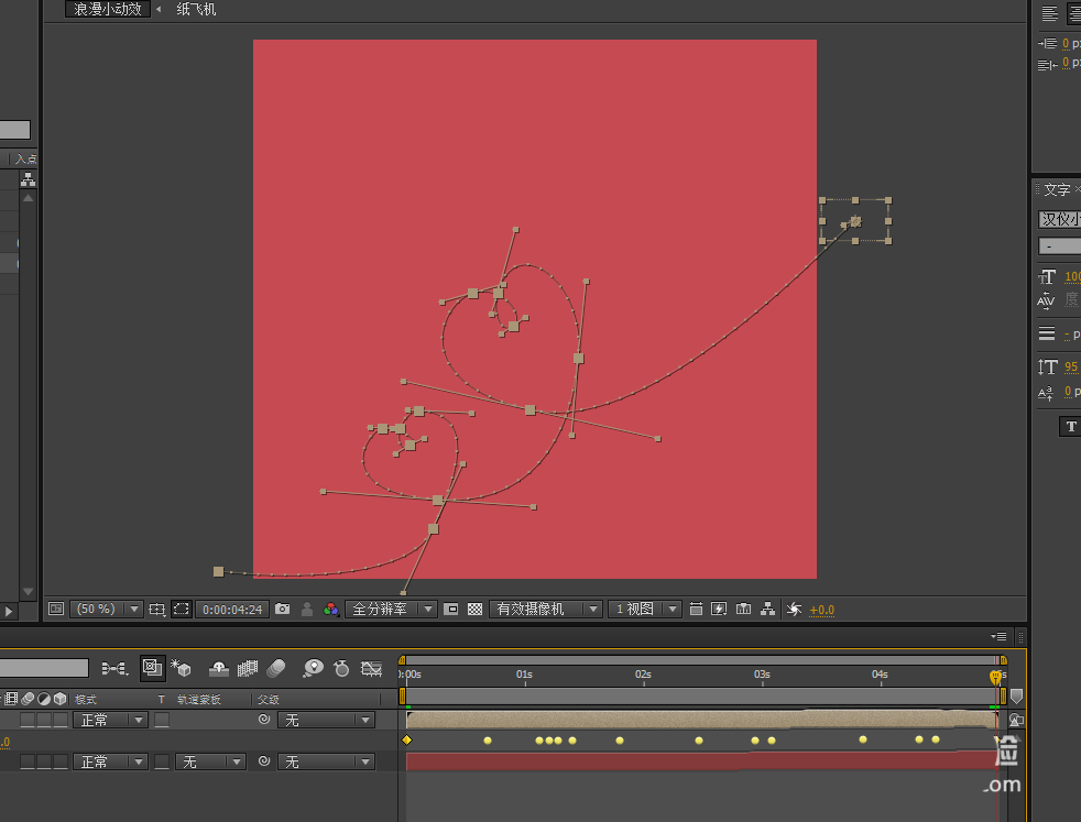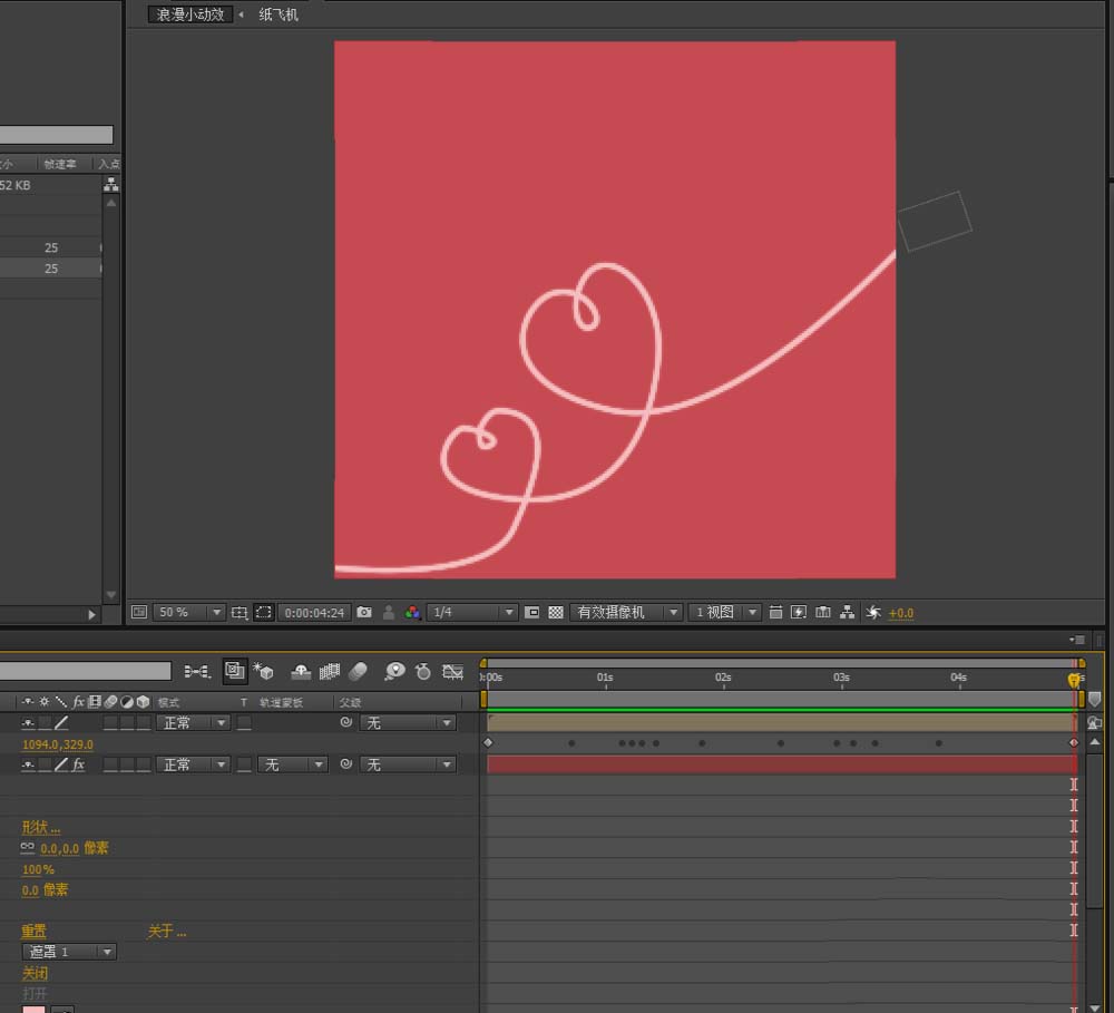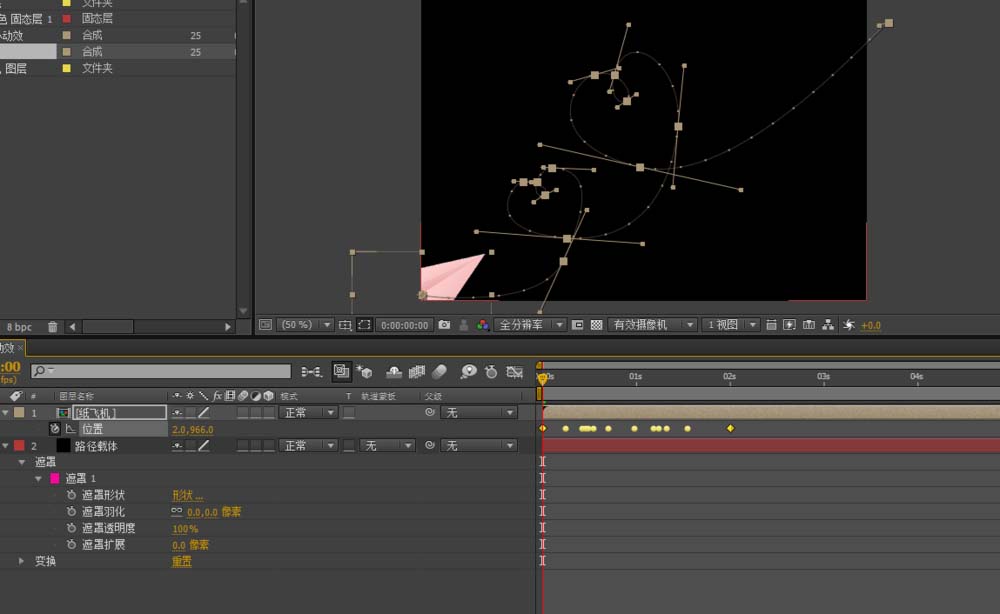 打开路径载体这个固态层的下拉属性,选中遮罩形状,CTRL+C复制路径,选中纸飞机这个素材图层,快捷键p键打开位置属性,CTRL+V黏贴路径。这时刚刚绘制的路径就复制到了纸飞机这个素材层上了。就是说纸飞机这个素材会按照我们绘制的路径来运动,同时关键帧也跟着复制过来了