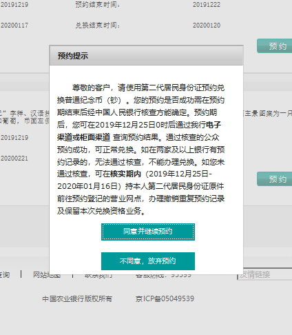 8、中国农业银行预约的纪念币数量是有限的,先到先得,大家要抓紧哦!鼠年贺岁普通纪念币每人预约、兑换限额为20枚。