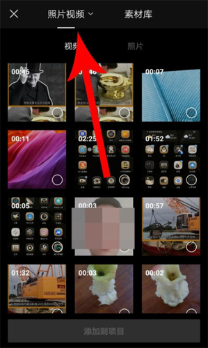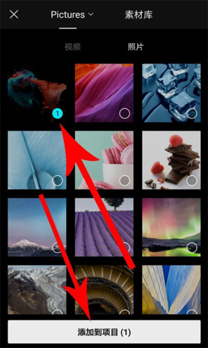 4、打开“照片”分类界面点选图片,然后点击“添加到项目”。