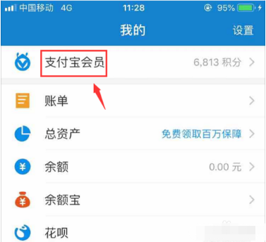 2、然后在支付宝会员页面行点击打开下面的“支付宝积分”页面。