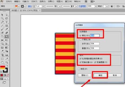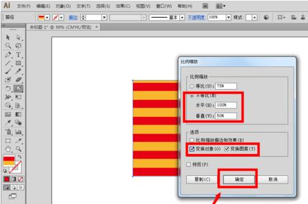假使不等比缩放的设置跟前面的一样,但同时勾选了”变换对象“和”变换图案“,点击确定