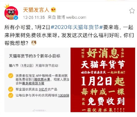 2020天猫年货节将在腊八当天(1月2日)启动,消费者可以参与种果树活动,免费获得至少1箱数字农业基地直供的优质水果。同时,天猫年货节还定下小目标:要帮全国农民卖出至少3亿斤优质农产品,让每位参与其中的农民过年前再增收至少1000块。