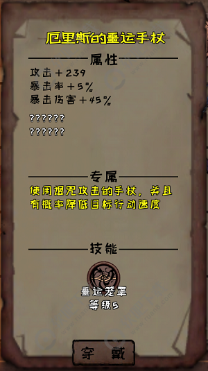 这是目前游戏中利用度比较高的一把武器,这是一把法杖,它没有专属分类,游戏中法杖的特性是站撸,攻击硬直有一点,单次攻击消耗精力较多,这把厄运杖的攻击力还是可以的。