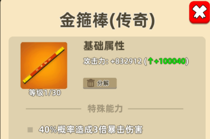 武器:传奇装备金箍棒,史诗高阶武器(去刷特殊能力暴击)。