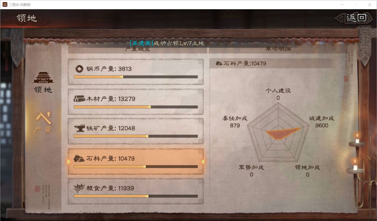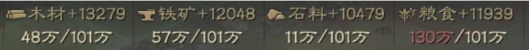 作为一个侠客军,长期的战斗下,粮食的溢出情况是最为严重的,但是好在可以爆仓。石料和铜币极为缺乏,只有在攻打相应的矿产时可以获取其20个小时的产量。好在商贾以及军势补给的资源兑换可以稍微缓解此情况。