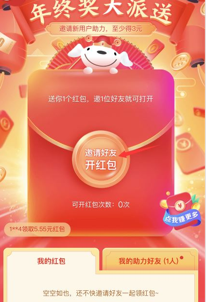 邀请好友助力,与好友一起开红包(活动期间每个用户每天最多可助力4次,全程最多可助力12次,但仅能为同一用户助力1次)