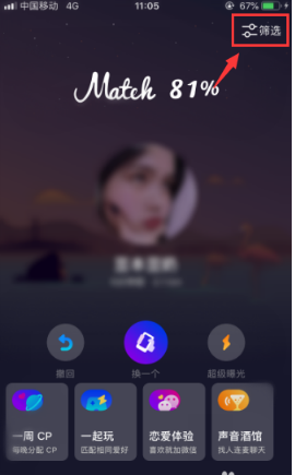1、点击打开红蓝cp软件,然后可以点击右上角的【筛选】选项进行设置我们的偏好。