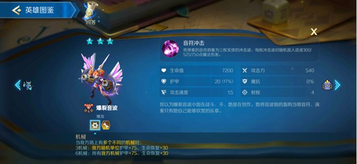 一身粉色,是她的形象;手持双粉色炮弹,成为她制胜的幸运符。她的技能为音符冲击,将弹奏的音符具象为三枚实体的冲击波,每枚冲击波对随机敌人造成最多750点魔法伤害。