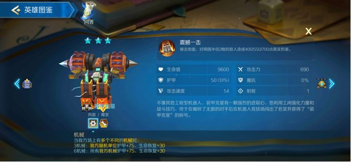 肩膀上的双钻头,搭配浑身闪着电的机械,给人一种很强的距离感。他的技能为震撼一击,可砸击地面,对周围半径2格的敌人造成最大700点真实伤害。