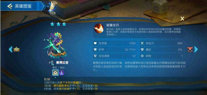 忍者的外型,绿色的刀光,是赛博忍者的特征。他的技能为能量光刃,挥刀向一名敌人发射能量光刃,造成最多1400点魔法伤害,并使其眩晕0.75秒。技能对星级低于自身的敌人造成双倍伤害,且大概率选取最近的敌人。