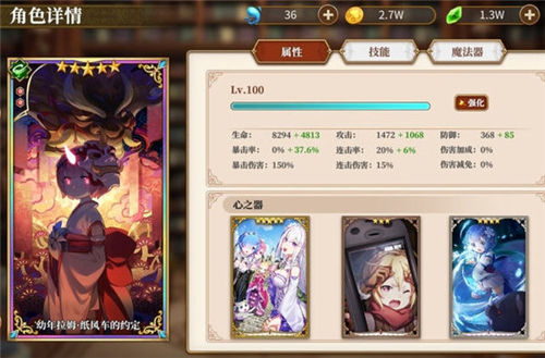 3、幼年拉姆就是用它的全体击飞控制,魔法器选附灵之戒和加攻击的,心之器选加攻击或者连击率的。