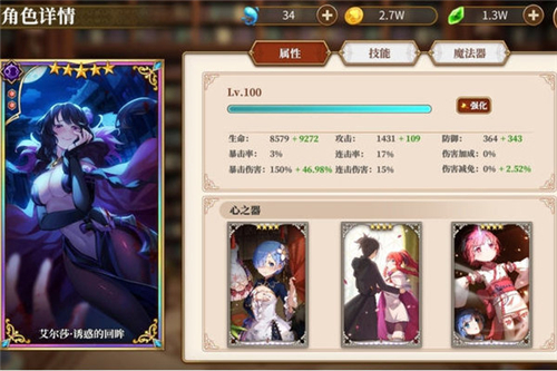 2、女剑圣是主力输出,对攻击了,魔法器用箭矢和加攻击力的,心之器选加攻击力的;
