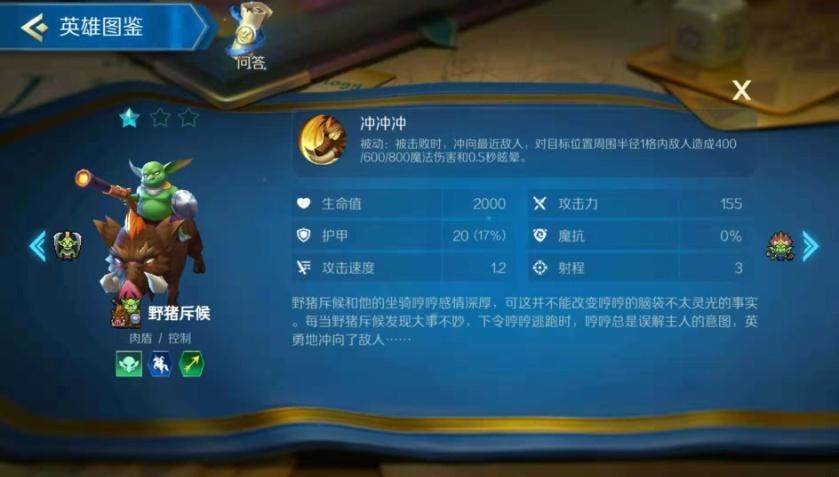 野猪斥候的技能比较鸡肋,如果不死相当于一个高级步兵。但是他的3羁绊让他在各种阵容中都可以有不错的发挥,在亡灵猎阵容中可以跟深渊骑士组成2骑士的羁绊,还能跟巫毒长老组成2哥布林的羁绊,是比较万金油的一个棋子。