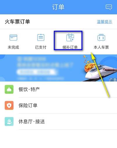 3、然后在订单页面上找到“候补订单”选项,点击打开候补订单选项页面
