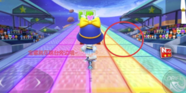 任务明确告诉我们宝藏在加速带附近,所以我们在跳上加速带之后不要开太快,看见宝箱吃掉即可,宝箱位置如下图。